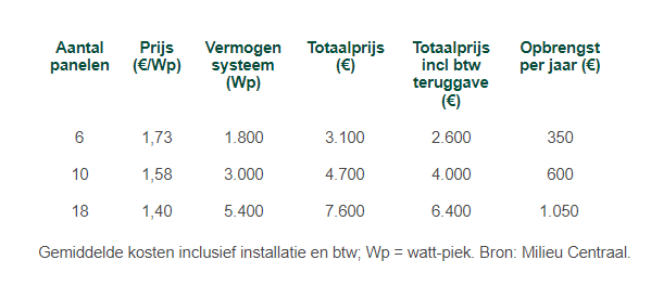 Je kunt het ook omrekenen naar een prijs per paneel: bij een set van 6 panelen kost een paneel 520 euro (inclusief installatie), bij